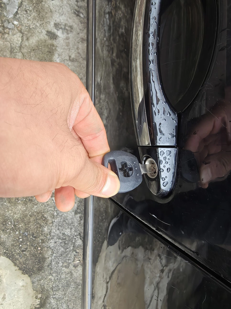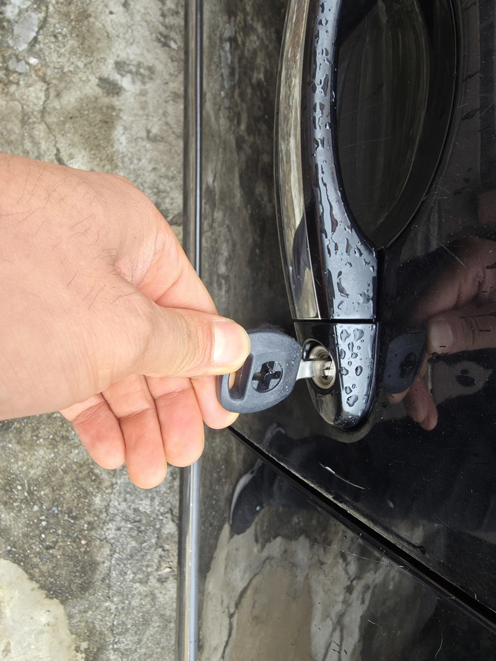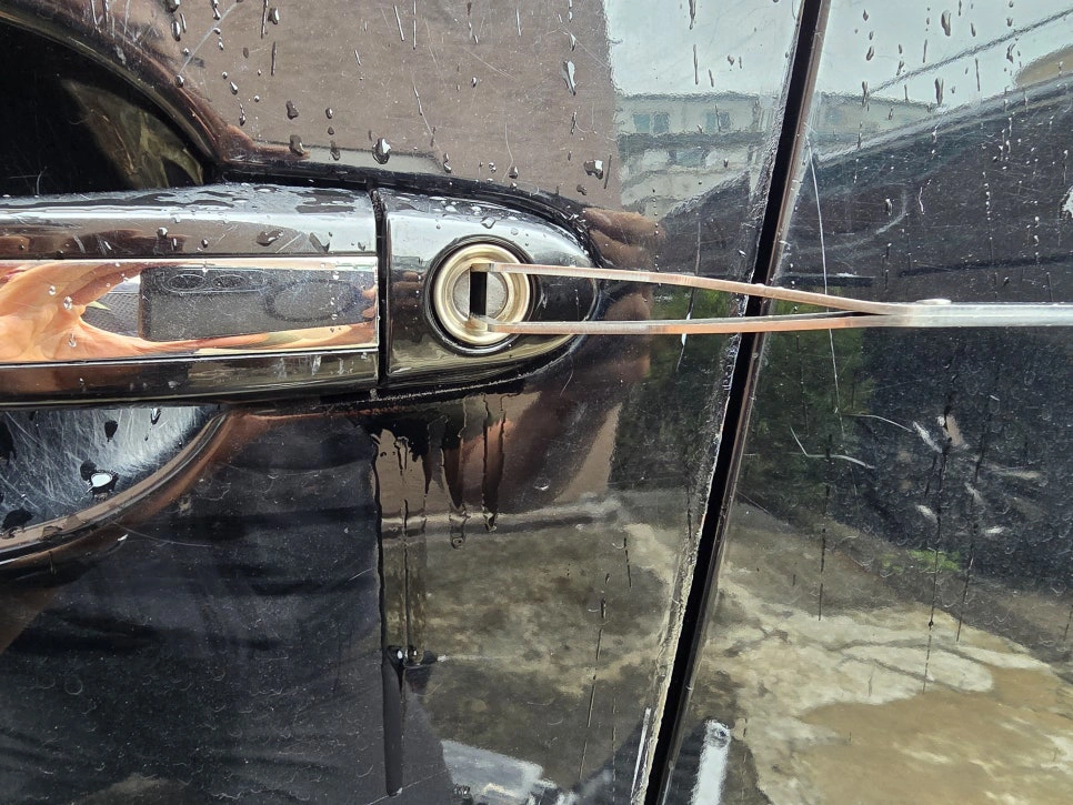 조심스럽게 각도를 잡아 핸들 도어락을 기준으로